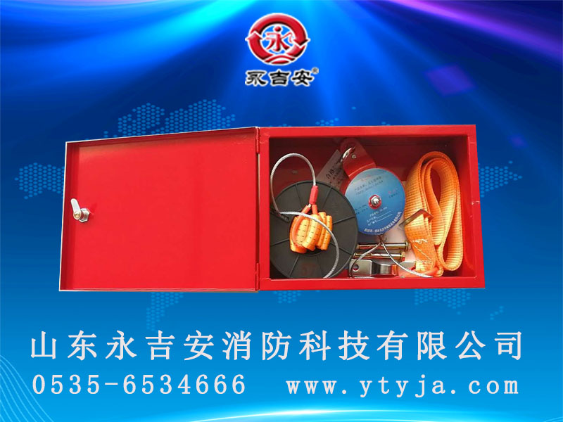 逃生緩降器由調(diào)速器、安全鉤、鋼絲繩、安全帶、掛架組成。