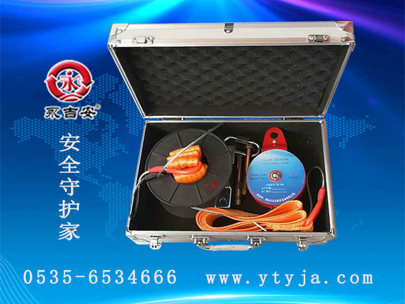 逃生緩降器由調(diào)速器、安全鉤、鋼絲繩、安全帶、掛架組成。